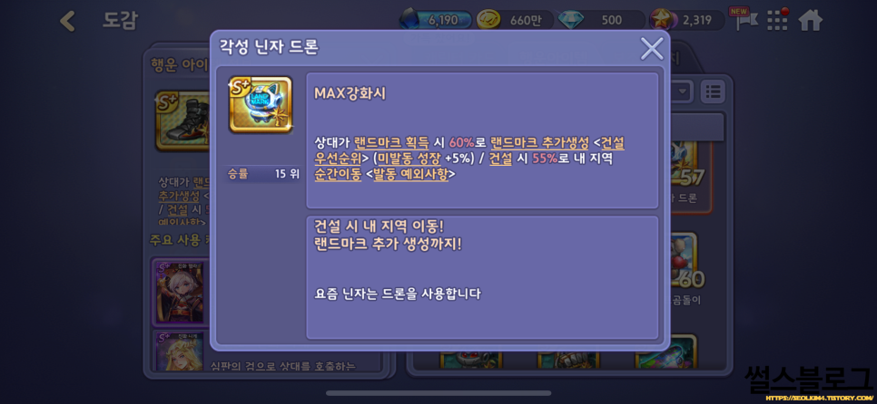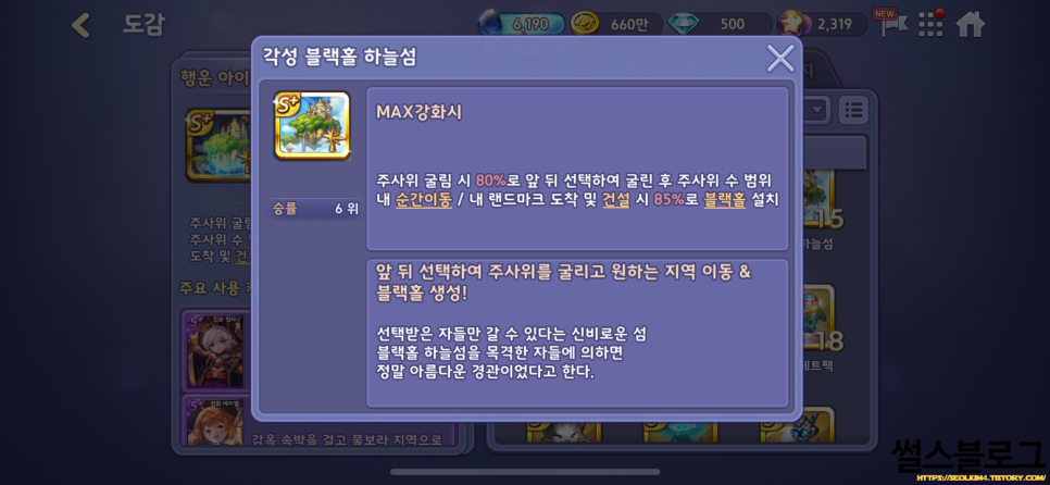 이전 포스트에서 소개시켜드렸던 진화 윤량의 경우, 회오리를 설치해 턴 종료 후 점점 퍼져나가 모서리 지역을 제외한 모든 땅의 구름을 설치해 상대방을 파산시키는 캐릭터였는데요, 최근 출시한 캐릭터 중, '진화 제월'은 내 지역 도착 및 건설 시 90% 확률로 같은 컬러 블록에 '달의 바다' 블록 효과를 설치합니다. 또한, 자신과 상대방이 주사위 더블 시 80% 확률로 에너지가 충전되며 4개의 에너지가 충전되면 경우 달의 바다 블록 지역에 달빛 조각을 낙하합니다. 달빛 조각이 투하된 모든 땅엔 랜드마크가 건설되고, 상대 지역인 경우 뺏고, 상대 랜드마크인 경우엔 2턴간 페인트를 칠합니다. 진화 제월의 경우는 주사위를 던질 기회마다 건설하고 더블만 치면 1턴만에 컬러독점으로 끝나는 무시무시한 독점 캐릭터입니다.
