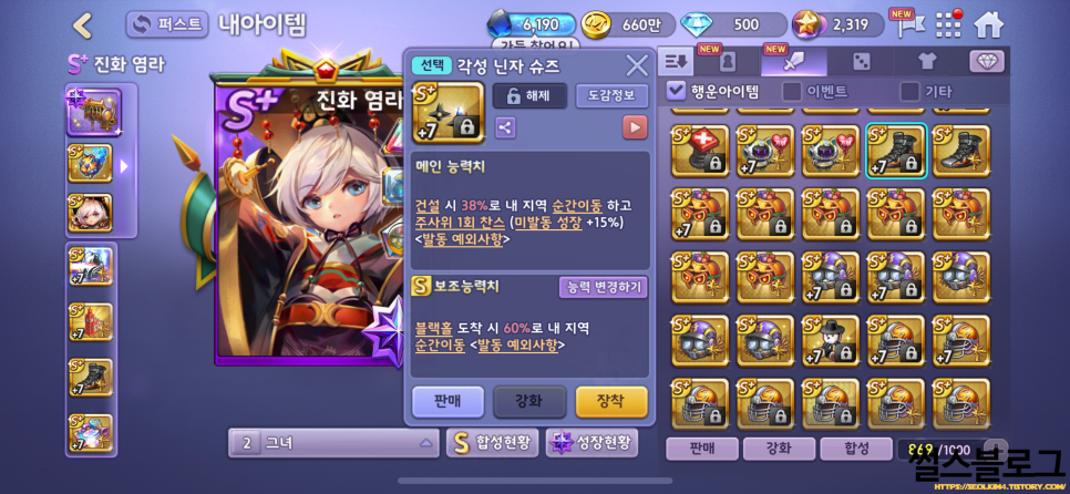 캐릭터 카드만 각성하고 진화하면 아쉽겠죠? 모두의 마블 행운 아이템은 각성합니다. 캐릭터 카드와 마찬가지로 이제 S+ 행운 아이템은 각성 행운 아이템에 비해 스킬 발동 확률이 낮아지기 때문에 오히려 사용하는 게 약점이 될 수 있습니다. 요즘 메타에서 필수템인 [블랙홀 하늘섬] 2개의 능력치가 [각성 블랙홀 하늘섬]에 비해 20%, 35%나 낮습니다. 이 밖에도 다양한 행운 아이템이 있는데, 일부는 S+ 행운 아이템에 추가적인 능력이 붙는 아이템도 있습니다. 또한, 모든 각성 아이템의 확률이 20-30%씩 높은 건 아니고, 5%씩 미미하게 올리는 경우도 있다는 점 참고해주세요.