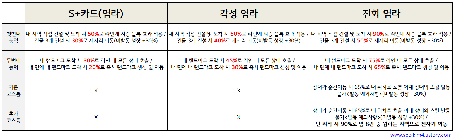 위에서 언급해 드린바와 같이, 진화 캐릭터 카드를 뽑았다면 끝이 아닙니다. 먼저, 진화 캐릭터 카드는 '기본 코스튬'을 주는데 일종의 보조능력치가 없는 행운 아이템입니다. 코스튬에는 절대 없어선 안 되는 핵심 스킬이 포함돼 있는 경우가 대부분이고 추가적으로 진화 캐릭터를 더욱 강력하게 만드는 능력치가 존재합니다. 최근 출시한 진화 염라의 경우 파산 캐릭터인데, '턴 시작 시 이동' 스킬이 없기 때문에 이와 관련된 행운 아이템이 꼭 필요합니다. 하지만 거미줄 캐치 봇(상대방이 순간 이동 시 30% 확률로 내 위치로 호출 후 상대방의 가장 비싼 땅 기부, 이때 상대 스킬 발동 불가)을 상대방이 가지고 있다면 오히려 역효과를 내기 때문에 '전자기 이동' 능력이 꼭 필요한데요, 바로 마황제 코스튬에 기본 기능+ 전자기 기능이 있어 염라에겐 최고의 효율을 만들어줍니다.