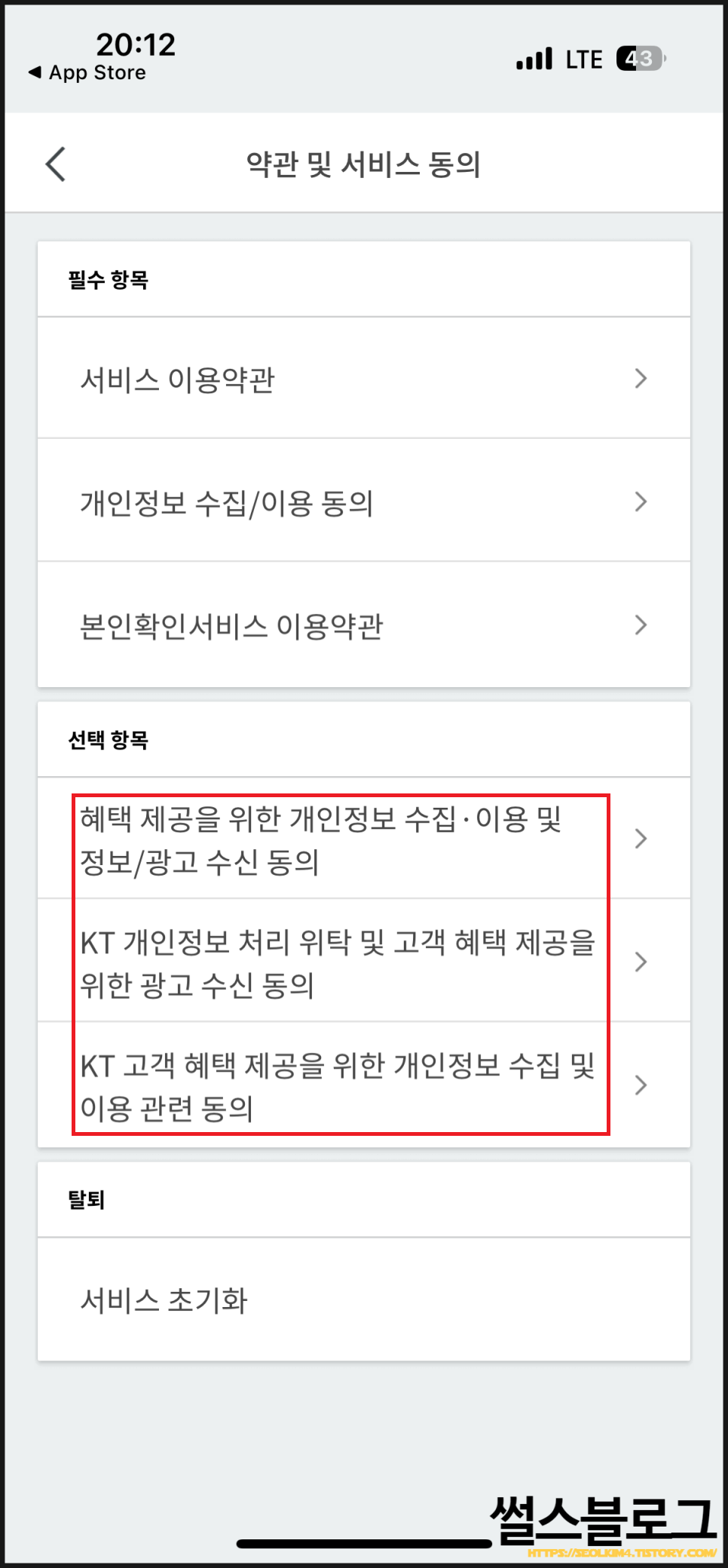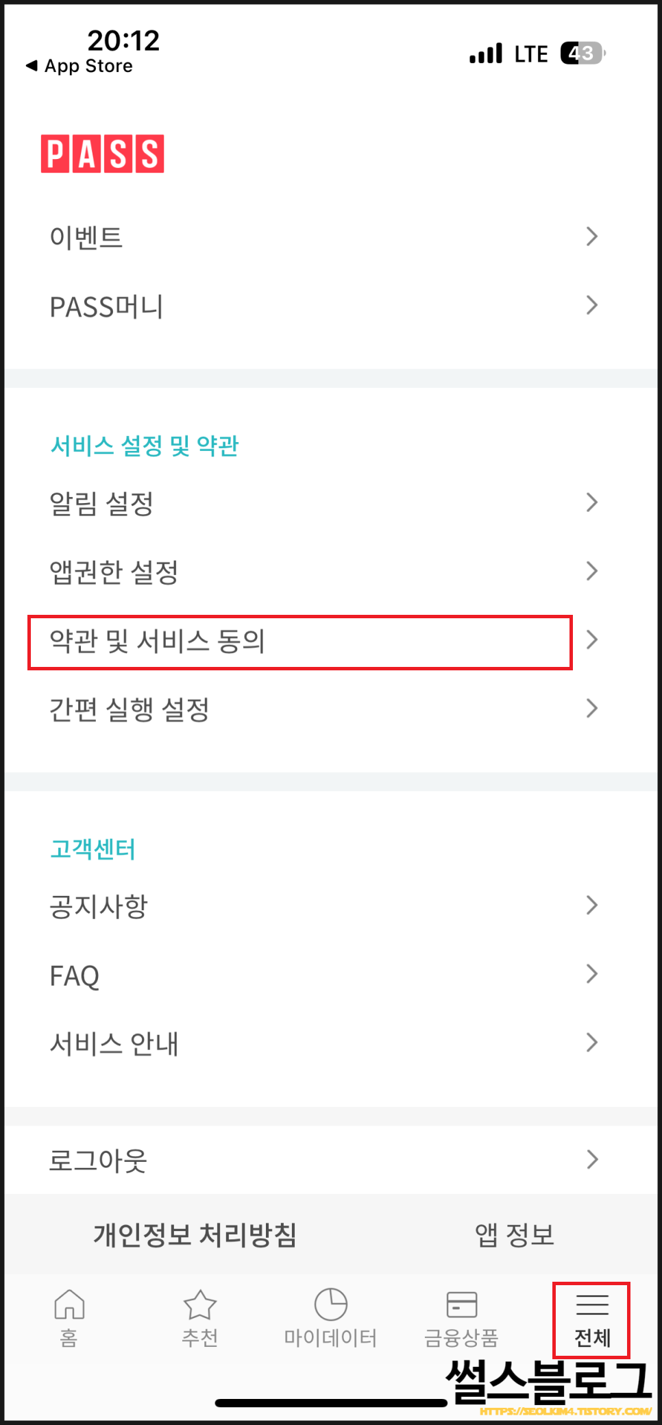 그렇다면 선택 항목을 철회하는 방법은 어떻게 할까요? 정말 간단합니다. 먼저 하단 탭의 [전체] - [약관 및 서비스 동의] - [선택 항목 탭의 3가지] - [동의 철회하기]를 선택하면 끝입니다.