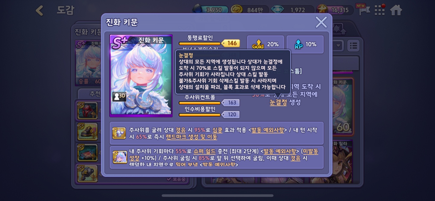 상대가 순간이동 시 55%로 내 위치 호출, 이때 상대의 스킬 발동 불가(미발동 성장 +30%) | n%로 상대의 호출 스킬 취소 | 내 주사위 기회 마다 n%로 슈퍼 실드 충전(최대 2단계) |