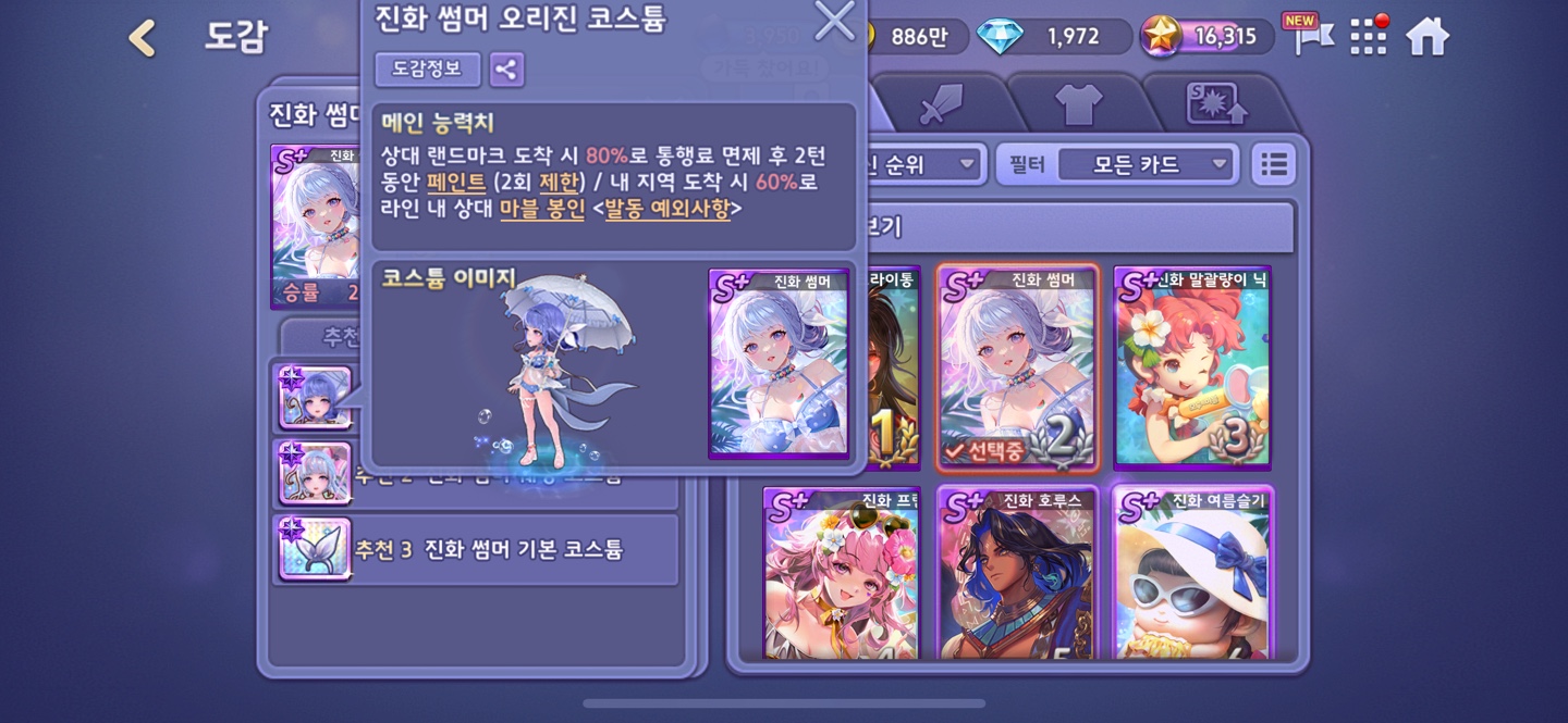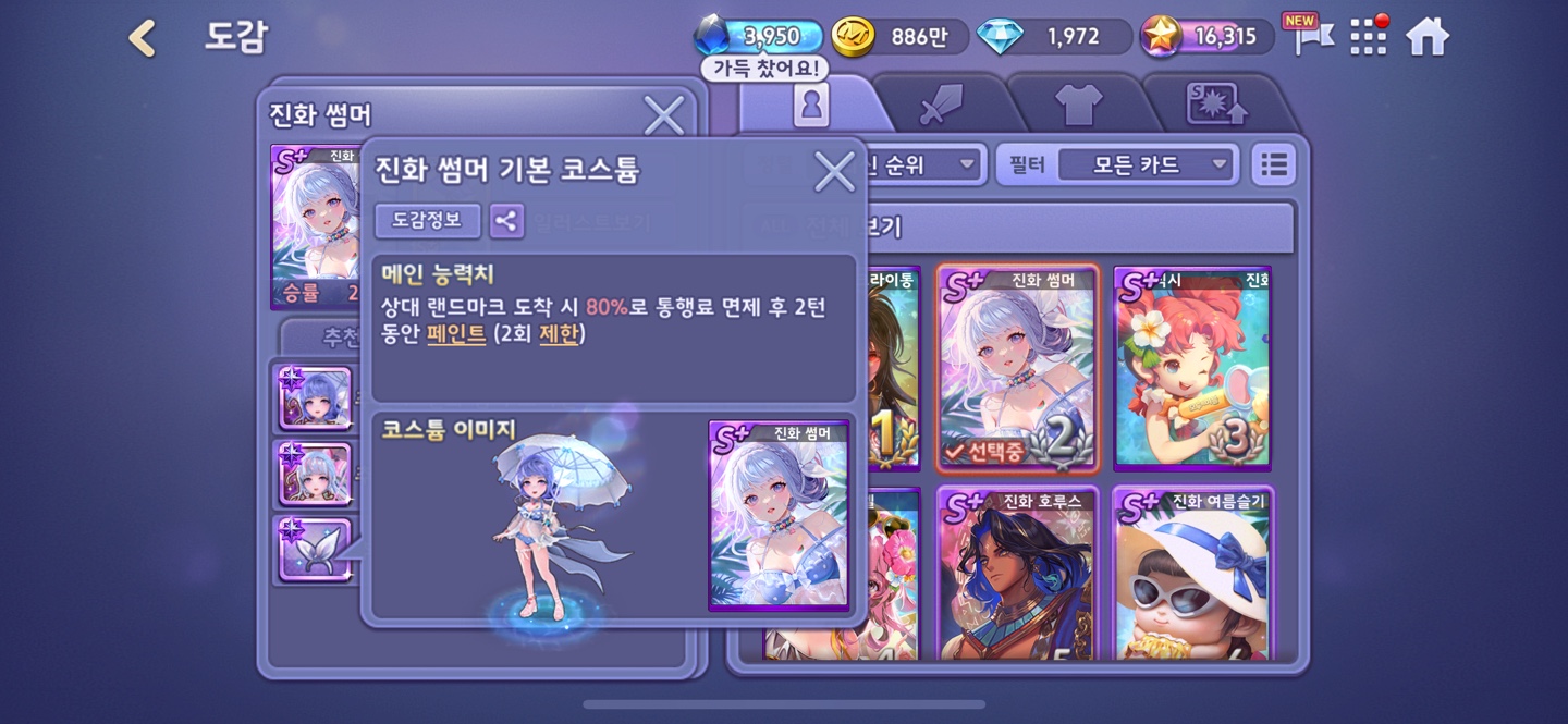 캐릭터 카드의 능력 또한 행운아이템처럼 더욱 늘어나고 있는데요, 기존에는 2+1의 능력이었다면 위의 이미지처럼, 썸머의 캐릭터카드의 능력치는 총 7가지입니다.