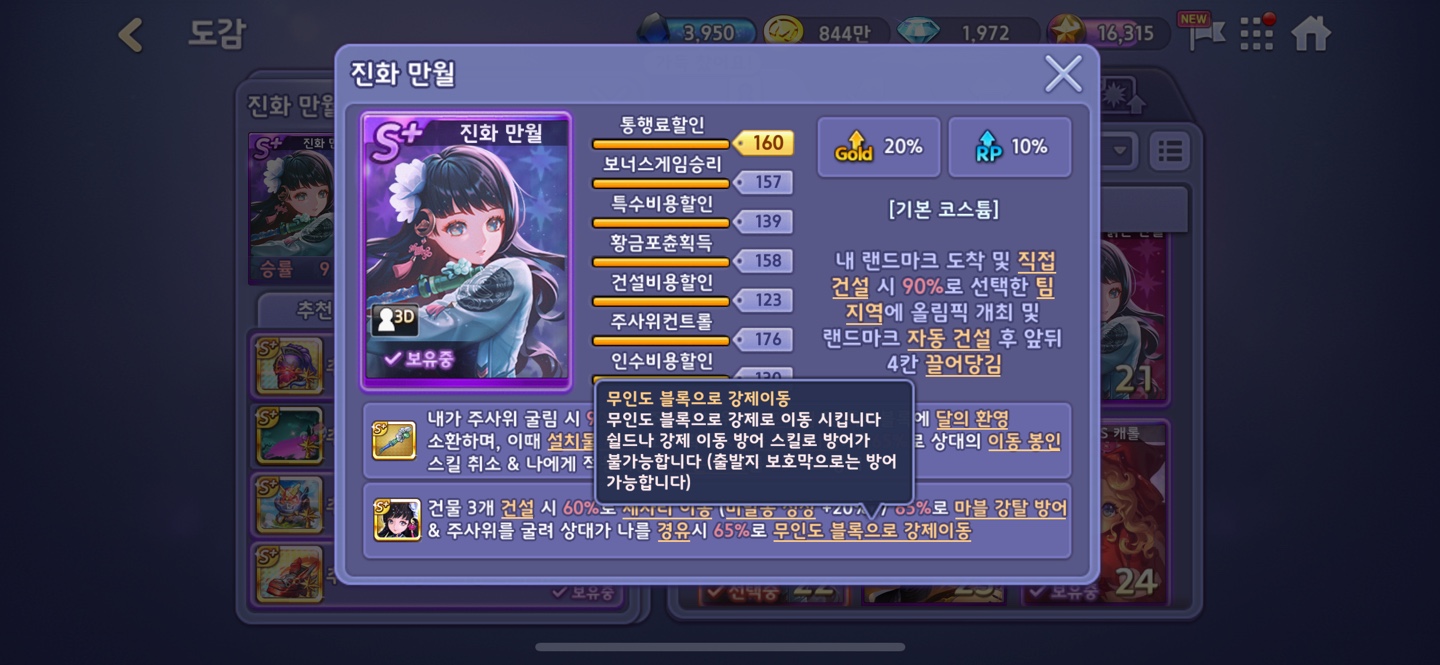 '상대방의 독점 경고 시 n%로 상대방 감옥 속박' 옵션은 나온 지 오래돼서 2년 전 모두의마블을 하셨던 분들이라면 다 아실 겁니다. 21년도 출시한 퀸 이사벨을 시작으로 감옥 속박이 캐릭터 내장 특화로 되었고 일부 캐릭터나 행운아이템에는 이 능력을 기본으로 탑재되고 있습니다. [감옥 속박] 능력은 상대방 강제 턴 종료 + 모든 캐릭터 능력/행운아이템 능력 무시입니다.